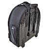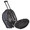 Два внутренних вкладыша для тарелок, 3 наружных кармана, ручки, ремень, можно носить как рюкзак, жёсткое дно с тезой и ножками, оснащён колёсами и выдвижной ручкой.